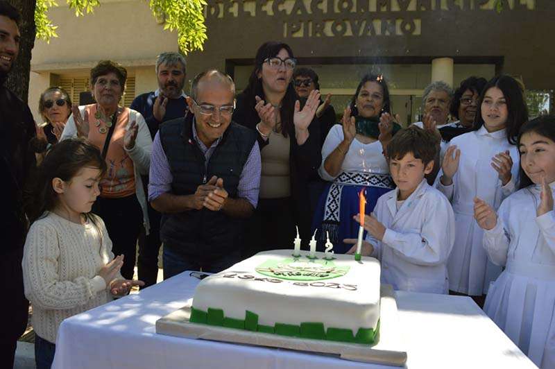 Niños y niñas de la Escuela Primaria participaron activamente de la celebración, compartiendo junto al intendente el tradicional “feliz cumpleaños” a la localidad, para luego disfrutar de un desayuno entre los presentes.