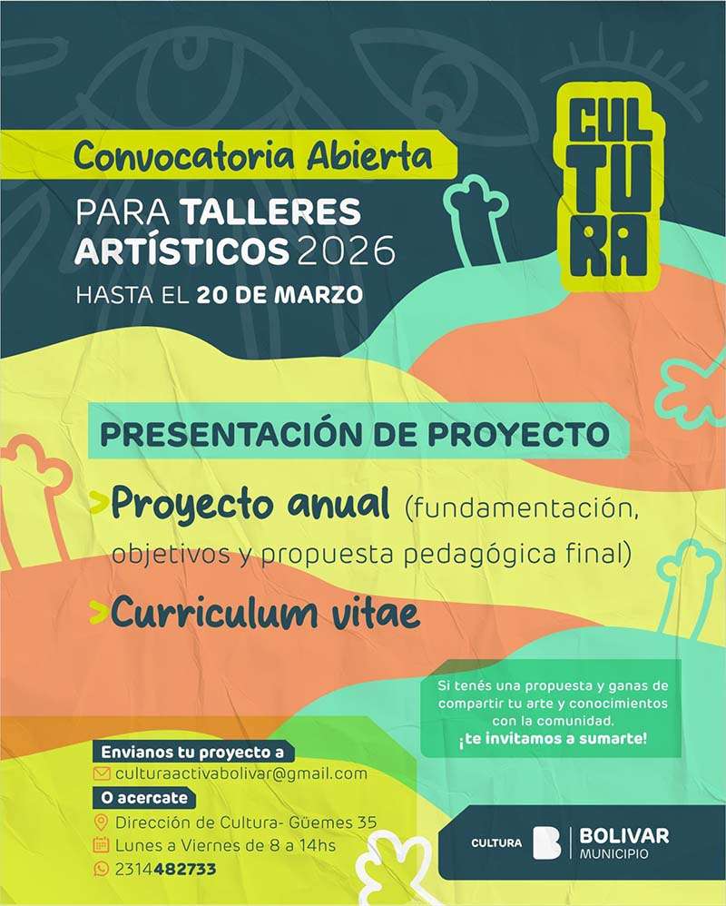 La Dirección de Cultura del Municipio de Bolívar informa que se encuentra abierta la convocatoria para la presentación de propuestas de talleres artísticos para el ciclo 2026, destinada a artistas, docentes y referentes culturales interesados en compartir sus saberes con la comunidad.