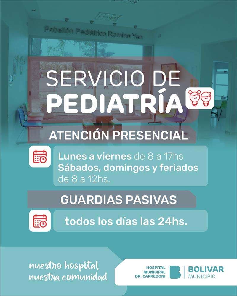 El Servicio de Pediatría del Hospital Municipal Capredoni cuenta con un hall exclusivo para pacientes pediátricos y funciona con atención presencial de lunes a viernes hasta las 17 h en el Pabellón Romina Yan. Los días sábados, domingos y feriados, el servicio dispone de atención pediátrica hasta el mediodía.