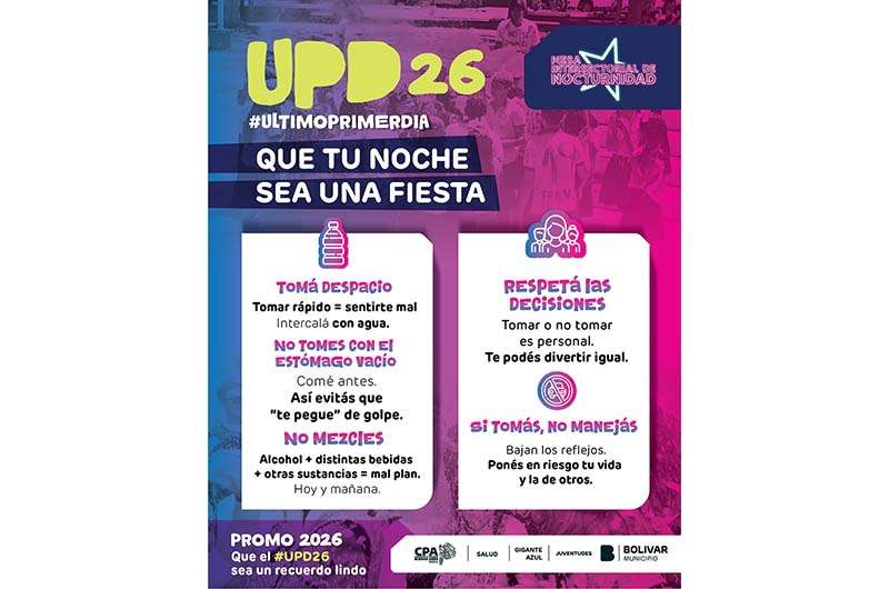 En el marco de la celebración del Último Primer Día (UPD) de los estudiantes de la promoción 2026, el Municipio de Bolívar, a través de la Mesa Intersectorial de Nocturnidad, llevará adelante acciones de prevención y acompañamiento destinadas a promover una noche segura y responsable para los jóvenes.