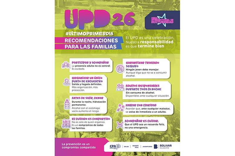 El UPD se ha convertido en una tradición para quienes comienzan su último año de secundaria. En ese contexto, desde las áreas municipales se trabaja de manera articulada para acompañar a los estudiantes y sus familias, brindando información y recomendaciones que permitan disfrutar del encuentro de forma cuidada.