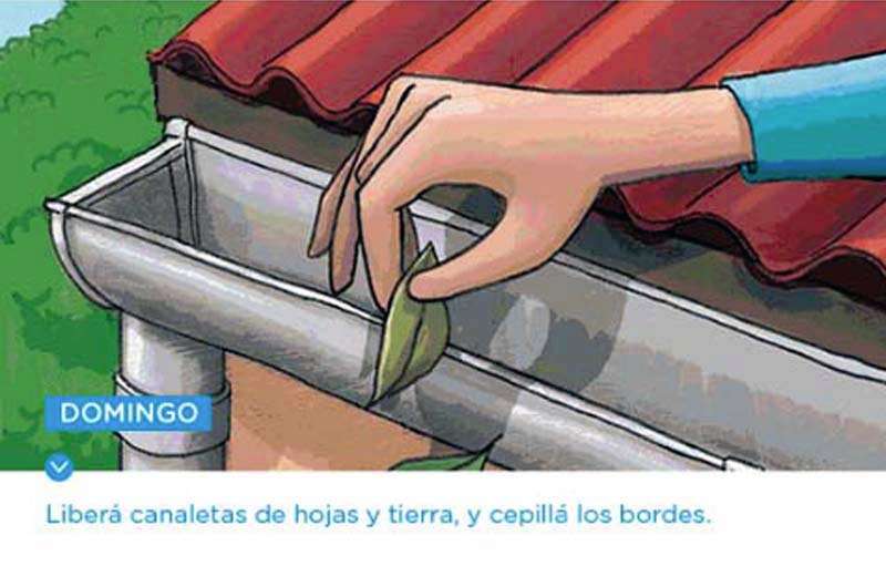 Liberamos canaletas: si tenés una canaleta al aire libre, liberala de hojas y tierra para que circule el agua. Después cepillá los bordes y revisá que tenga bien la inclinación para drenar.